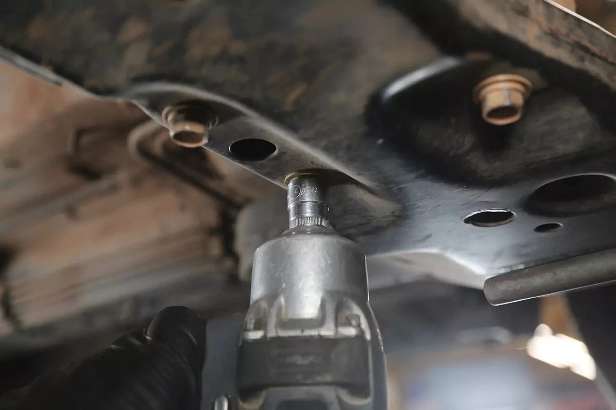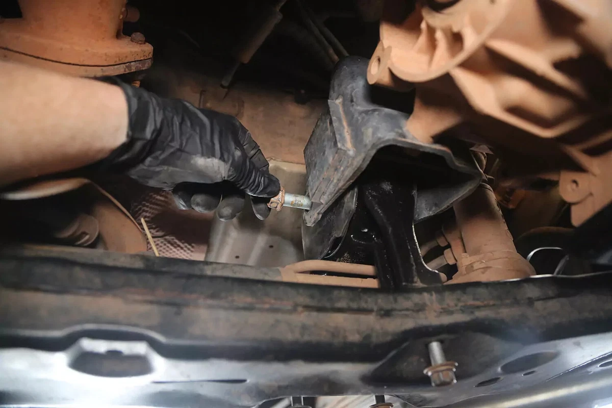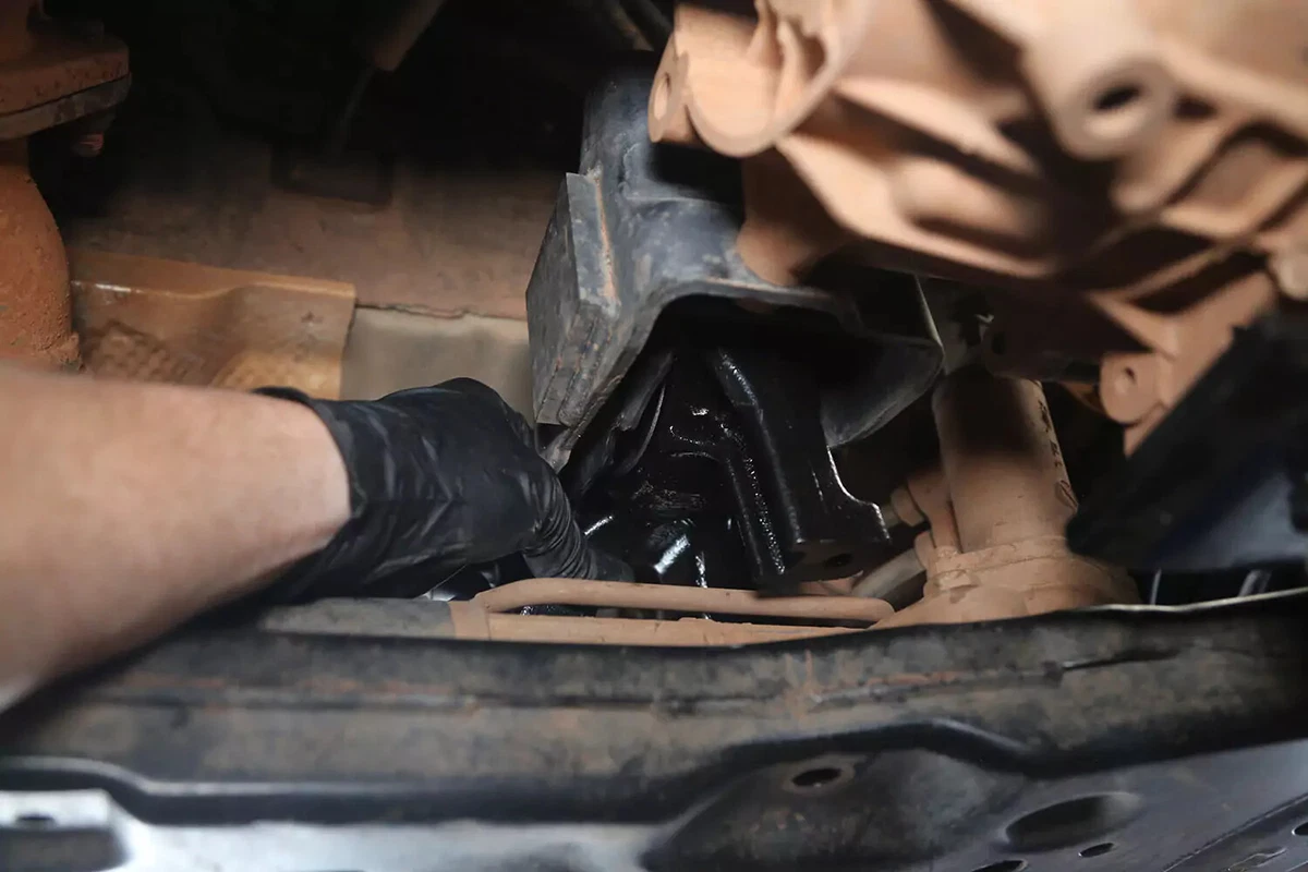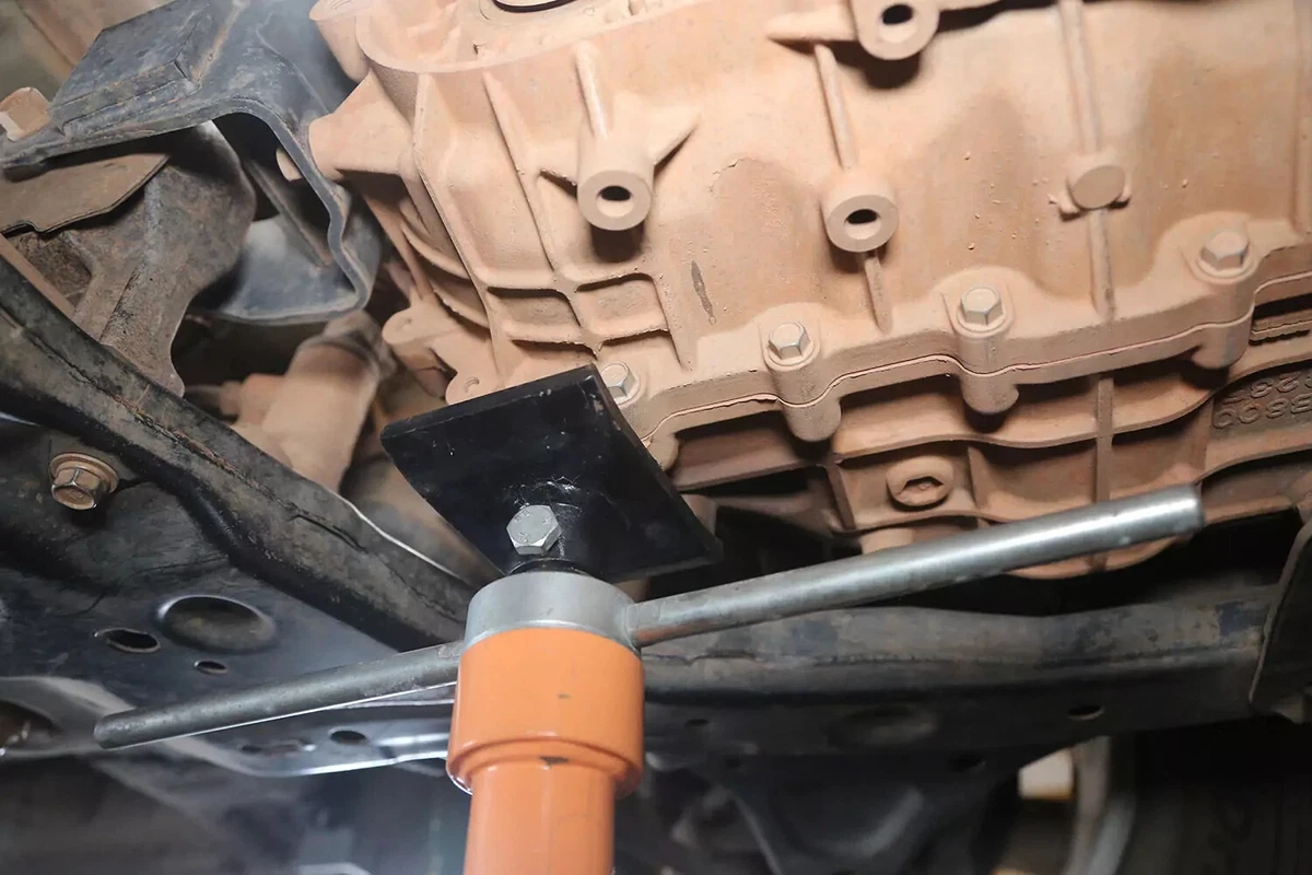 Gure FWD demo-ibilgailuan, transmisioaren euskarria transmisioaren atzean dago aurreko azpimarkoaren gainean. AWD, 4WD edo RWD ibilgailu bat baduzu, euskarria ziurrenik transmisioaren atzealdean egongo da, ia zuzenean autoaren azpian zentratuta, transmisioaren eta zeharkako gurutzeriaren artean.