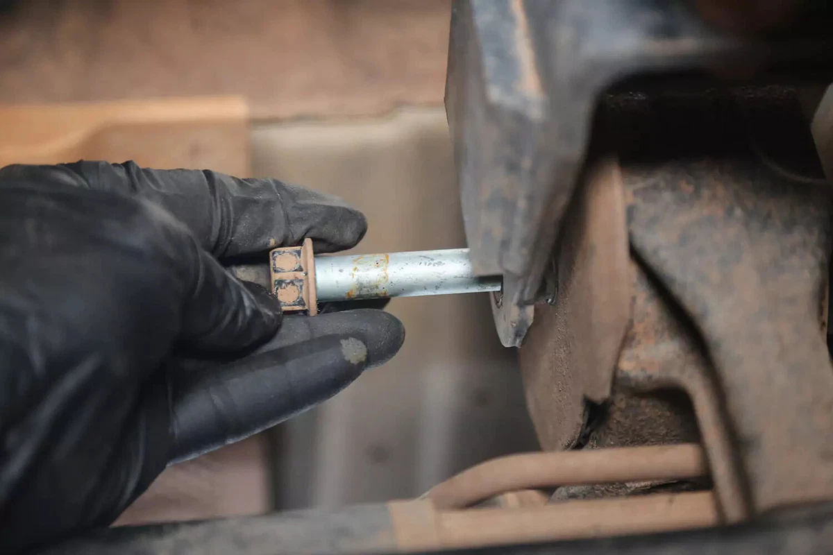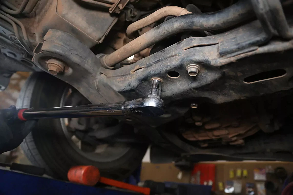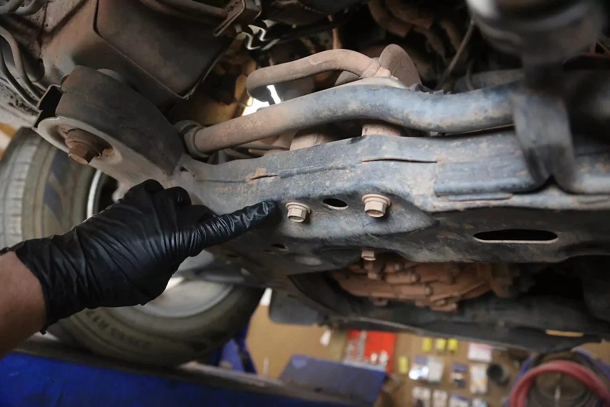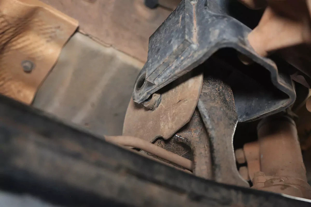 Gure FWD demo-ibilgailuan, transmisioaren euskarria transmisioaren atzean dago aurreko azpimarkoaren gainean. AWD, 4WD edo RWD ibilgailu bat baduzu, euskarria ziurrenik transmisioaren atzealdean egongo da, ia zuzenean autoaren azpian zentratuta, transmisioaren eta zeharkako gurutzeriaren artean.